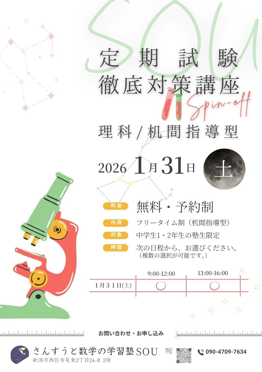 「さんすうと数学の学習塾SOU」の定期試験徹底対策講座のスピンオフとして、なんと『理科講座』を開催します!